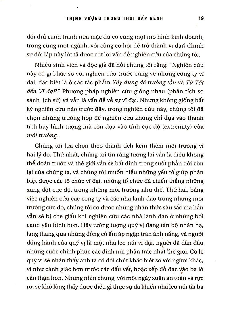 Và kết quả nghiên cứu sẽ gây bất ngờ cho nhiều nhà lãnh đạo các tổ chức đọc quyển sách này: Những nhà lãnh đạo của các công ty vĩ đại không sáng tạo hơn, không có tầm nhìn xa hơn, không có cá tính hơn, không có vận may hơn, không thích tìm kiếm rủi ro hơn, không anh hùng hơn, và không có khuynh hướng thực hiện những nước cờ lớn, táo bạo hơn. Nhưng họ đã lèo lái được công ty họ qua những lúc khó khăn để luôn trường tồn, bởi vì họ sống và làm việc theo ba yếu tố cân bằng nhau: kiên định với nguyên tắc, sáng tạo theo kinh nghiệm và biết sợ hãi một cách hữu ích.