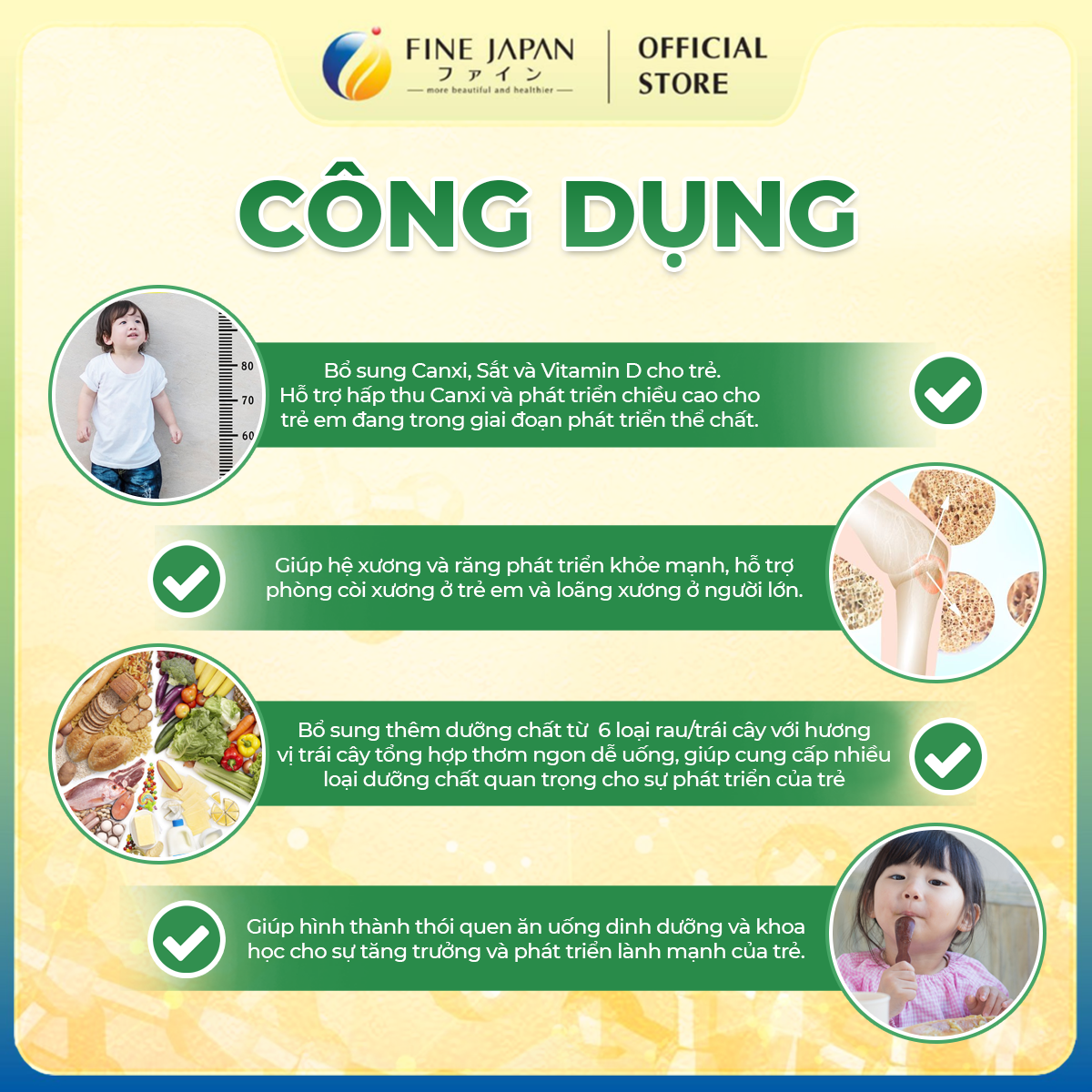 Giúp hệ xương và răng phát triển khỏe mạnh, hỗ trợ phòng còi xương ở trẻ em và loãng xương ở người lớn. Hỗ trợ tăng trưởng toàn diện cho trẻ.