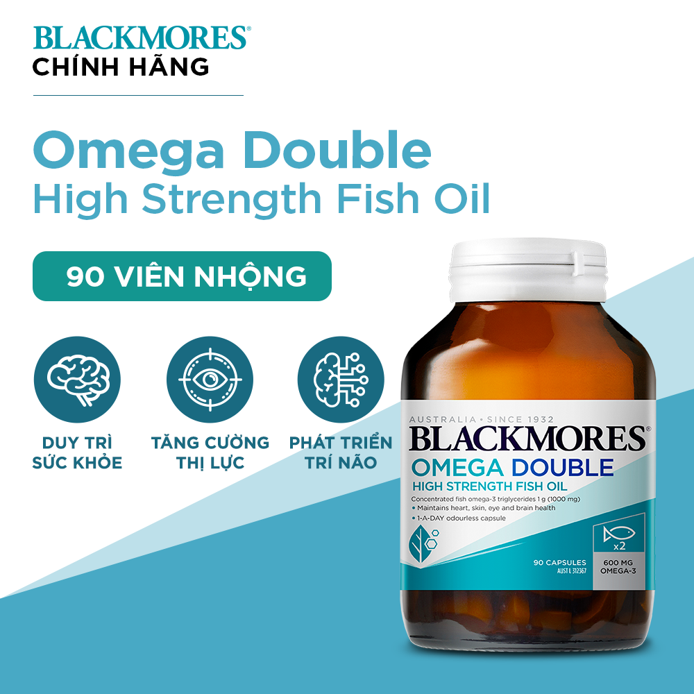 Viên uống Blackmores Omega Double High Strength Fish Oil Thành phần: Omega-3: 600mg tương đương: Eicosapentaenoic acid (EPA): 360mg, Docosahexaenoic acid (DHA): 240mg Công dụng: + Hỗ trợ quá trình lão hoá của não