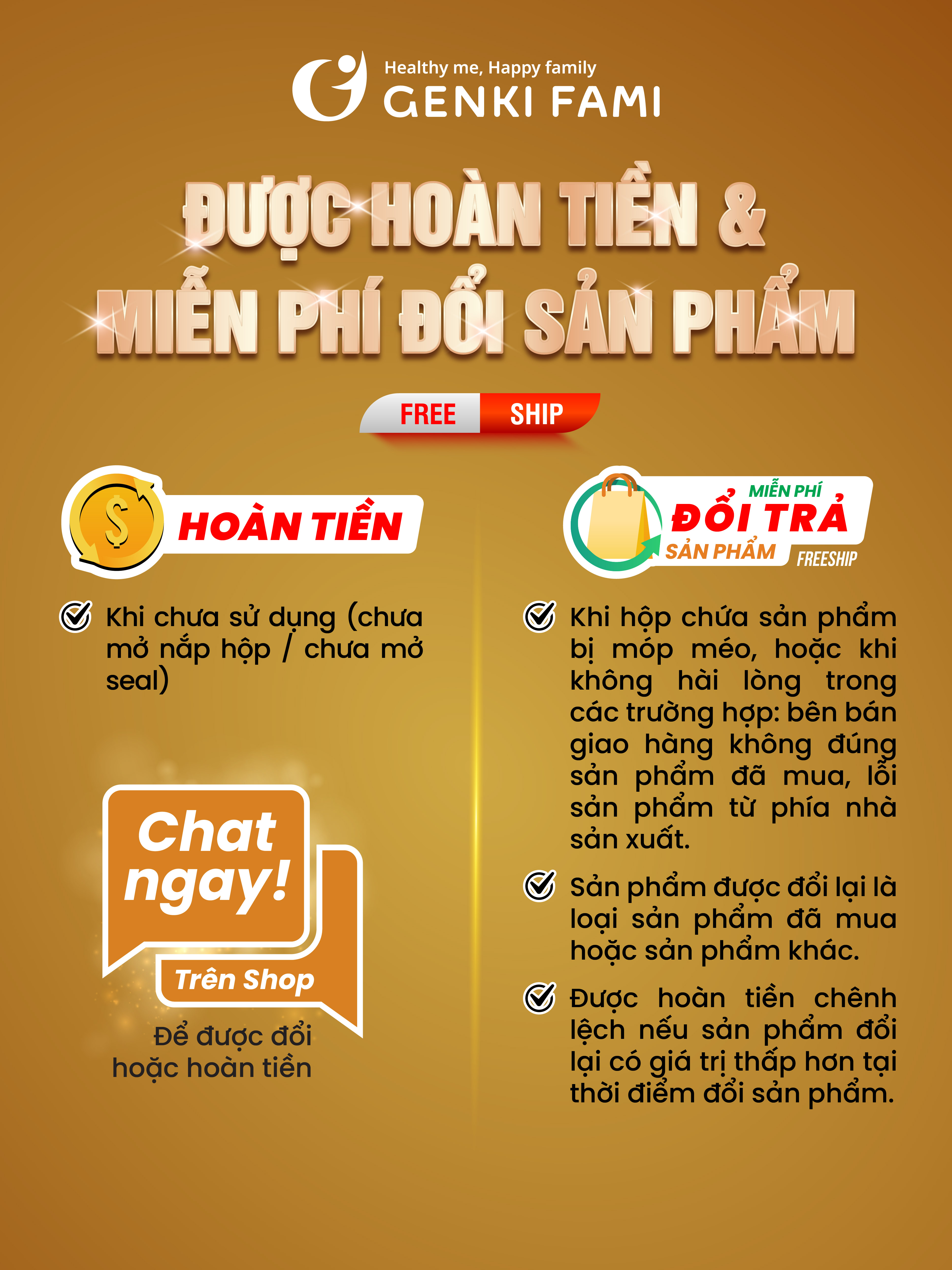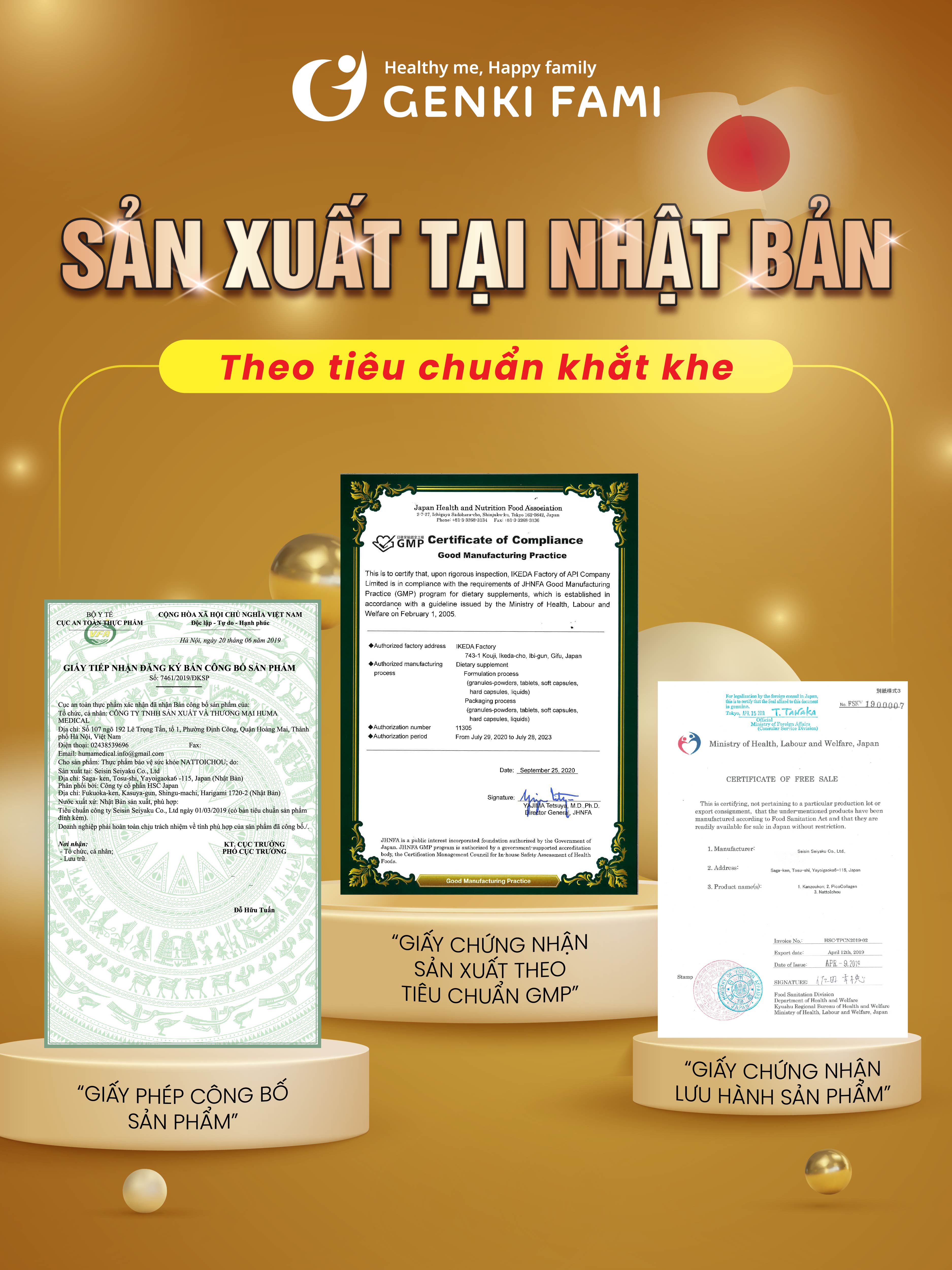 - Người bị tiểu đường thì nên thường xuyên sử dụng sản phẩm. QUY CÁCH SẢN PHẨM: Số lượng viên/ hộp: 90 viên nang/hộp. Liều lượng: Uống 3 viên/ ngày sau khi ăn. Hạn dùng: 36 tháng kể từ ngày sản xuất, hạn sử dụng in trên bao bì sản phẩm. NGUỒN GỐC VÀ CHỨNG NHẬN: Xuất xứ: Nhật Bản Thương hiệu: Genki Fami Nhập khẩu và phân phối chính hãng bởi công ty TNHH SX&TM Huma Medical Chứng nhận công bố sản phẩm của Bộ Y tế số: 7221/2019/ĐKSP.