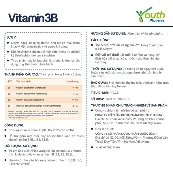 ✨Viên Uống Vitamin 3B Youth Pharma Bổ Sung Vitamin Nhóm B (B1, B6, B12) - Hộp 100 Viên