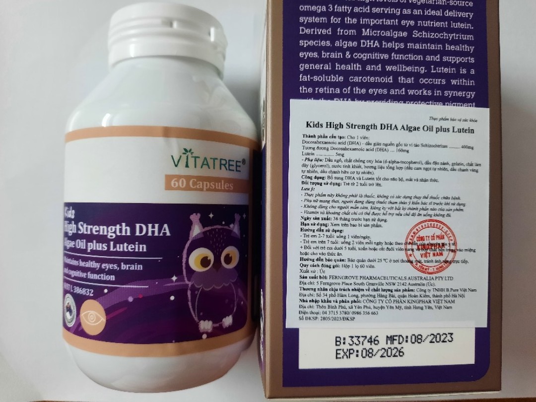 Mua tại TiktokThành phần: DHA nguồn gốc từ Vi tảo 400mg Lutein 5mg Đối tượng sử dụng: Trẻ em từ 2 tuổi trở lên Công dụng: Bổ sung DHA và Lutein, cần thiết cho sự phát triển của Não bộ, mắt, nhận thức của trẻ. Công ty chịu trách nhiệm: Công ty Cổ phần Kingphar Việt Nam Nguồn gốc: Nhập khẩu Úc, thương hiệu Vitatree Liểu dùng: Trẻ em 2-7 tuổi: 1 viên/ ngày Trẻ em trên 7 tuổi : 2 viên/ ngày Bảo quản: Nơi khô mát tránh ánh sáng trực tiếp Quy cách lọ 60 viên.