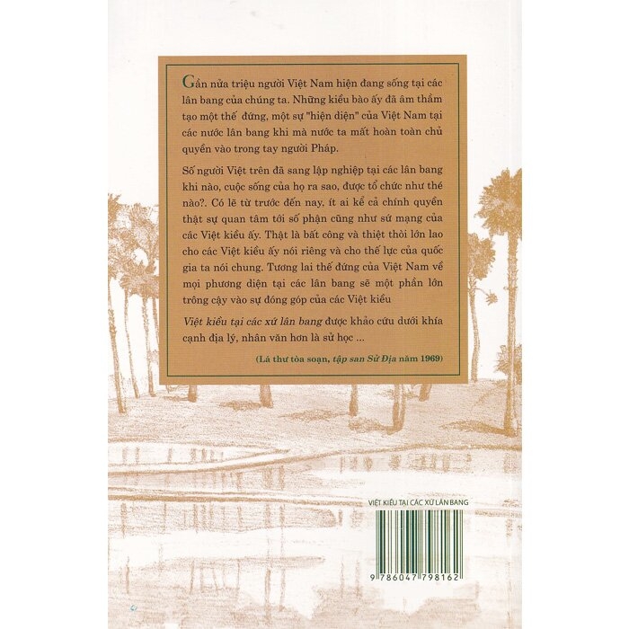 Việt Kiều Tại Các Xứ Lân Bang Gần nửa triệu người Việt Nam hiện đang sống tại các lân bang của chúng ta. Những kiều bào ấy đã âm thầm tạo một thế đứng, một sự "hiện diện" của Việt Nam tại các nước lân bang khi mà nước ta mất hoàn toàn chủ quyền vào trong tay người Pháp. Số người Việt trên đã sang lập nghiệp tại các lân bang khi nào, cuộc sống của họ ra sao, được tổ chức như thế nào?. Có lẽ từ trước đến nay, ít ai kể cả chính quyền thật sự quan tâm tới số phận cũng như sứ mạng của các Việt kiều ấy. Thật là bất công và thiệt thòi lớn lao cho các Việt kiều ấy nói riêng và cho thế lực của quốc gia ta nói chung. Tương lai thế đứng của Việt Nam về mọi phương diện tại các lân bang sẽ một phần lớn trông cậy vào sự đóng góp của các Việt kiều. Việt kiều tại các xứ lân bang được khảo cứu dưới khía cạnh địa lý, nhân văn hơn là sử học (Lá thư tòa soạn, tập san Sử Địa năm 1969)