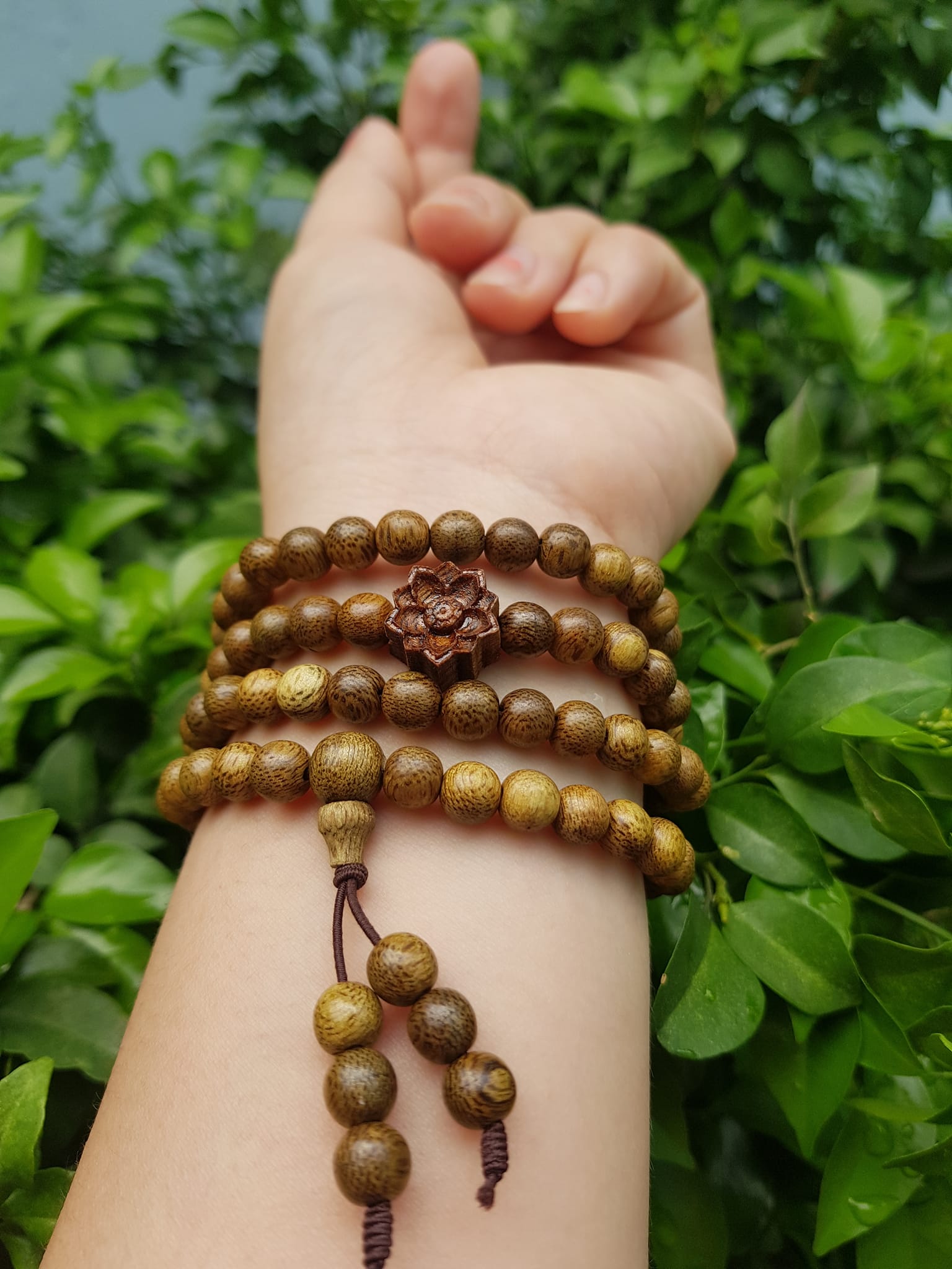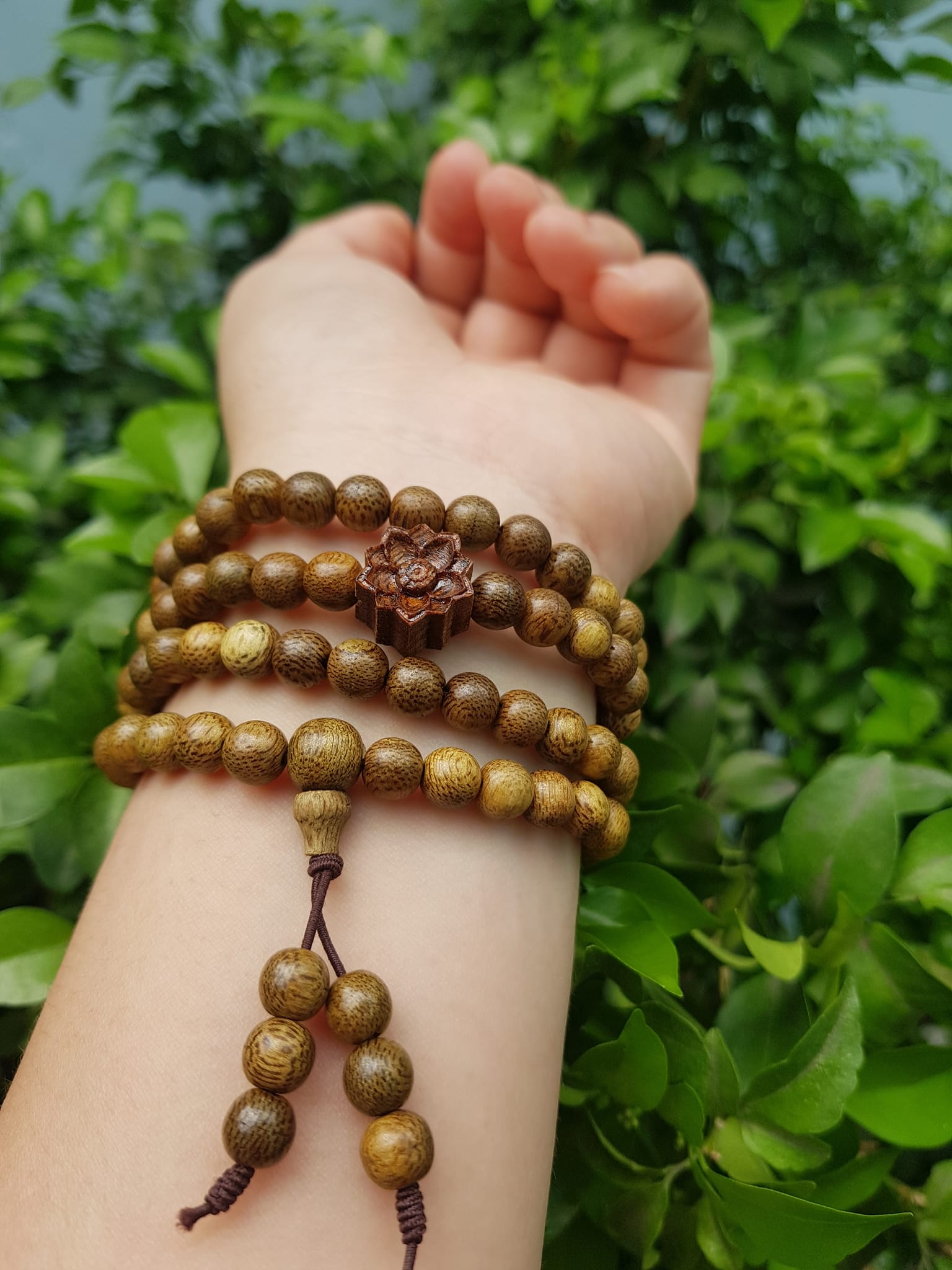 ✨Vòng đeo tay nữ gỗ trầm mix bông hoa sen kiểu quấn tay 4 vòng may mắn tài lộc Size hạt 6mm Màu vàng nâu vân sáng nhẹ đeo tay rất đẹp xinh mùi thơm nhẹ nhẹ ạ