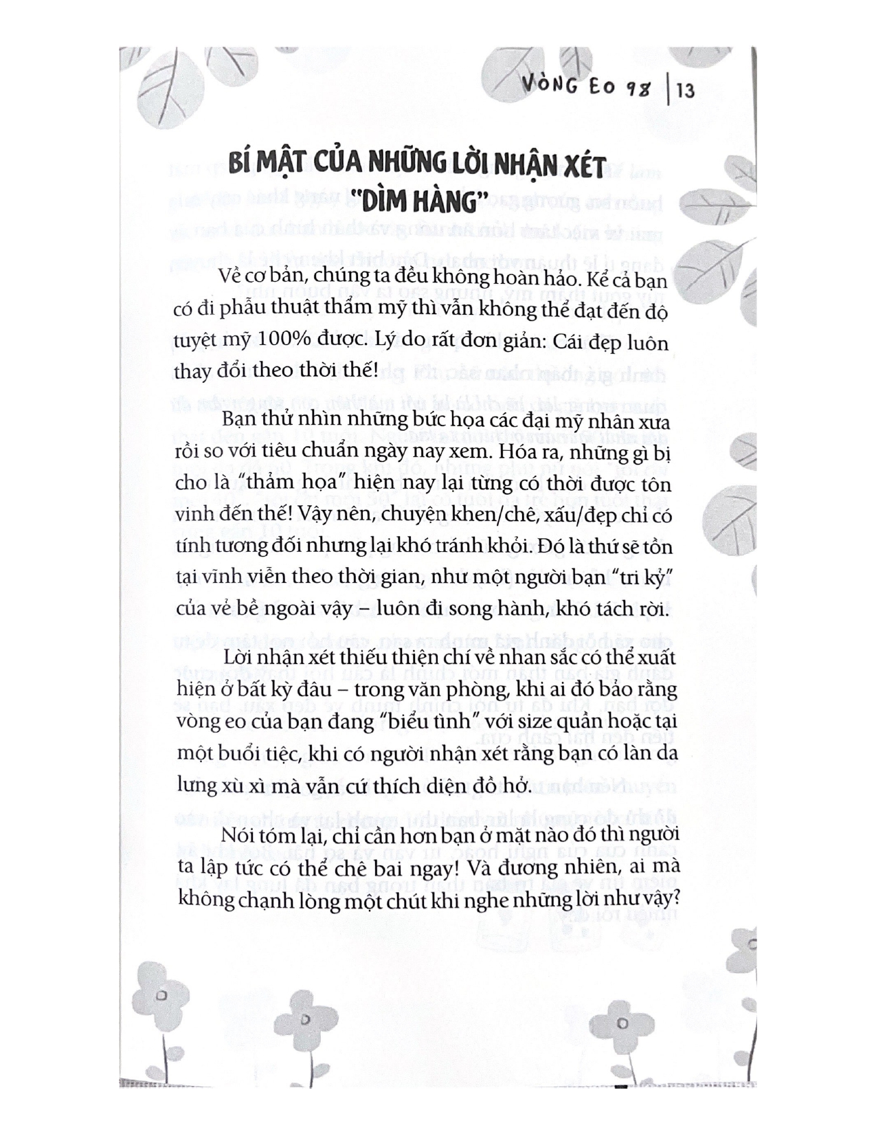 Vậy nên, cuốn sách này có tựa đề VÒNG EO 98 -VẺ ĐẸP KHÔNG HOÀN HẢO với tinh thần cổ vũ, khích lệ, sẽ không có những rào cản, mặc cảm, dằn vặt hay trách cứ bản thân. Cuốn sách muốn lan truyền thông điệp về cách sống tích cực và trước tiên: Bạn phải là chính mình.”