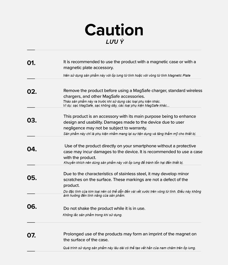 - Nên tháo sản phẩm này trước khi sử dụng sạc Magnetic, sạc không dây hoặc các phụ kiện Magnetic khác.