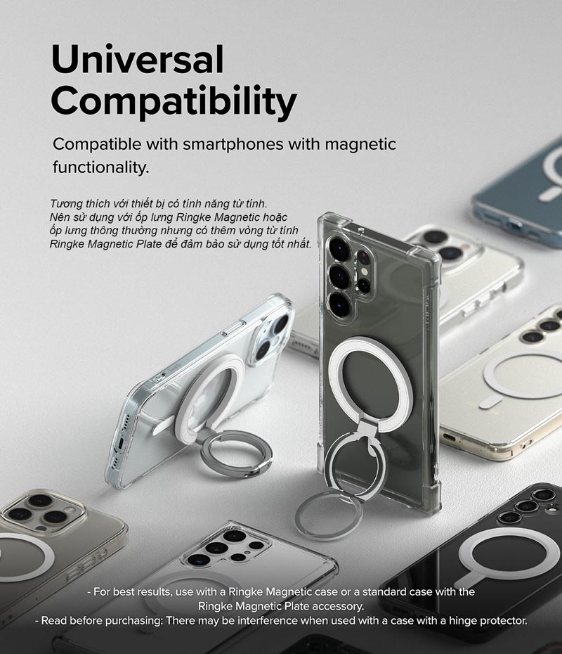 - Tương thích với các thiết bị điện thoại có tính năng từ tính. Lưu ý: sản phẩm chỉ là vòng từ tính, không bao gồm ốp lưng hoặc các phụ kiện nào khác. Hình ảnh chỉ minh họa tính năng của sản phẩm. GIỚI THIỆU RINGKE Ringke là thương hiệu nổi tiếng trong lĩnh vực công nghệ được thành lập từ năm 2003. Là thương hiệu đến từ Hàn Quốc với tiêu chuẩn chất lượng và độ hoàn thiện cực kỳ tốt. Các sản phẩm của Ringke thường được khách hàng đánh giá cao bởi triết lý “Live A Better Day”, nhờ vậy các sản phẩm của Ringke hướng đến giải quyết những vấn đề thường ngày của khách hàng nhằm mang đến sự tiện dụng và thoải mái nhất. MỘT SỐ LƯU Ý KHI SỬ DỤNG SẢN PHẨM NÀY