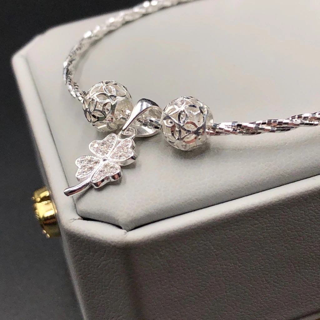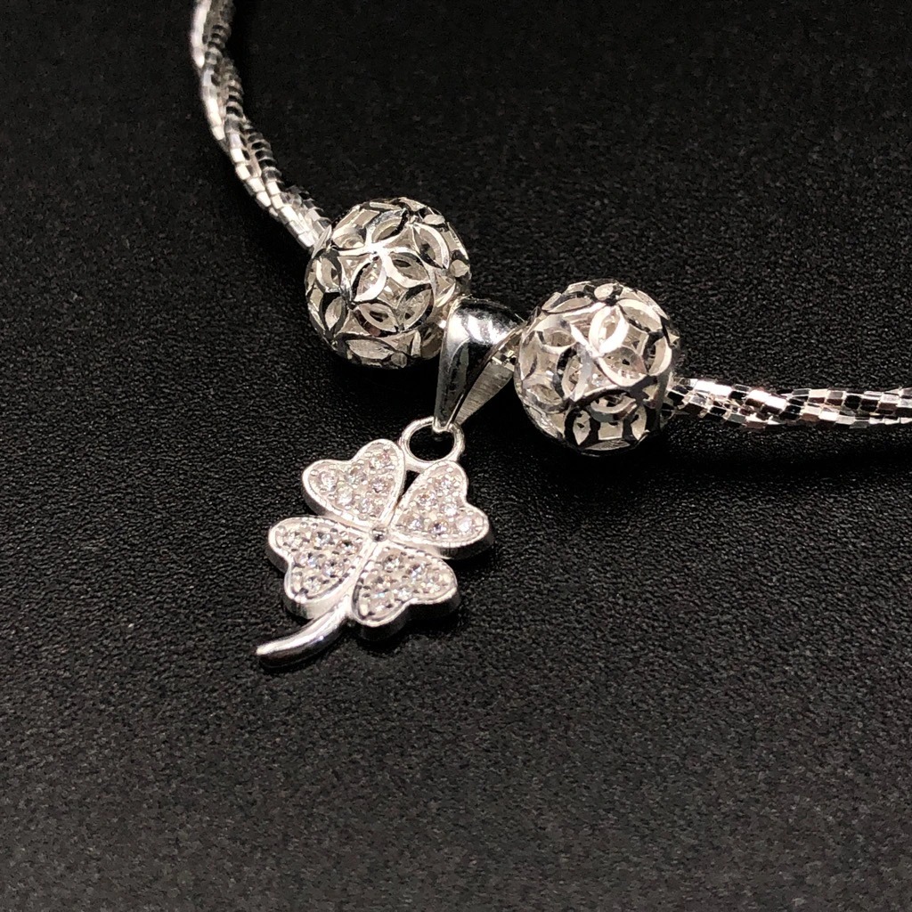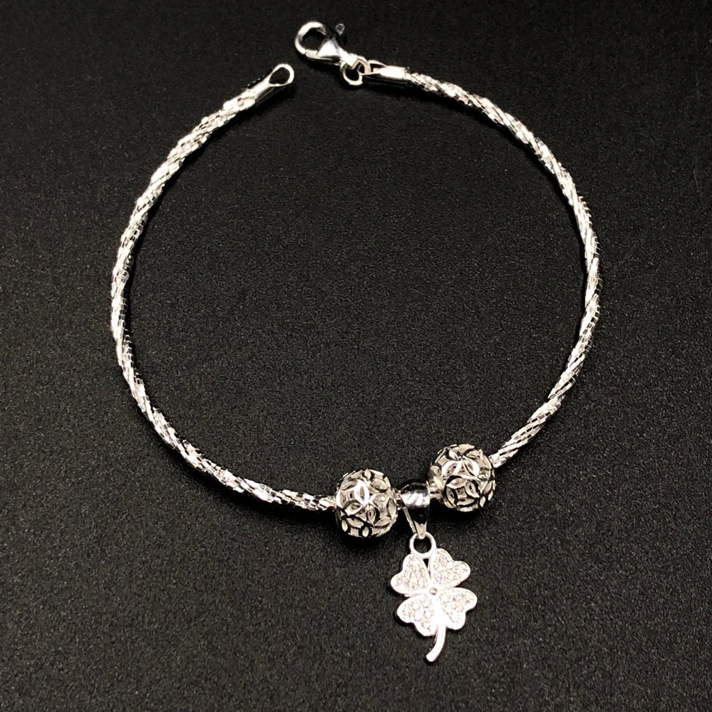 Vòng Tay Lắc Tay Nữ Dây Xoắn Tròn Bạc Ta Charm Bi Cầu Và Cỏ 4 Lá May Mắn Bạc Hiểu Minh LTU570X