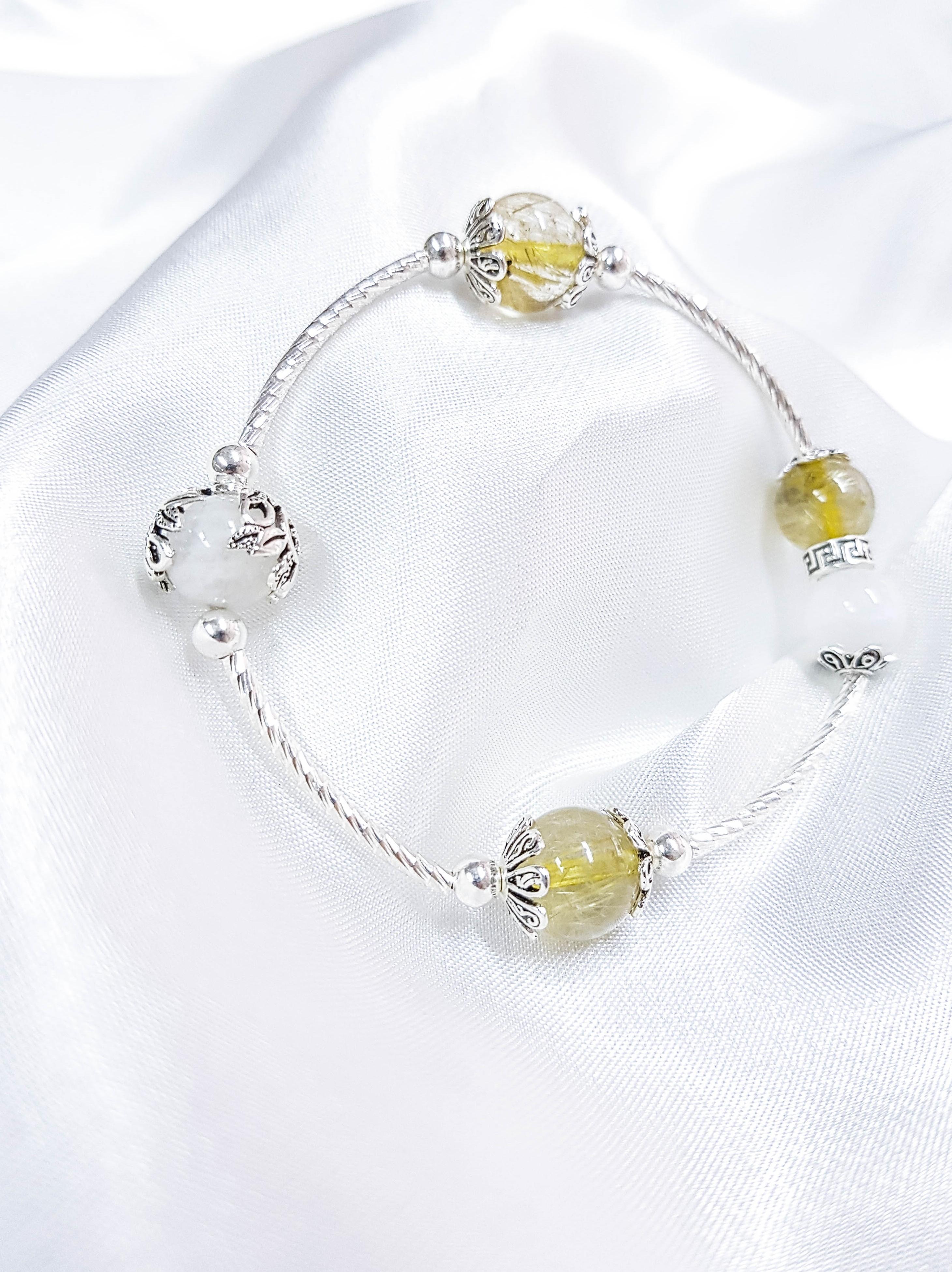 Tác dụng của đá: Thạch anh tóc vàng chính là nguồn năng lượng phát triển rất lớn trong phong thủy. Đem lại cho con người tinh thần minh mẫn, lạc quan và tích cực. Bên cạnh đó còn tạo nên sự thăng hoa, hạnh phúc trong tình duyên đôi lứa. Thúc đẩy sự tập trung trí óc, hoạt động năng nổ phù hợp với người nghiên cứu khoa học. Hay làm kinh doanh buôn bán. Thạch anh tóc vàng còn mang lại sự may mắn, sức khỏe tốt và giúp cho chủ nhân tránh xa mọi khổ đau bệnh tật. Đá thạch anh ưu linh có khả năng tăng cường sức khỏe, giải trừ bệnh tật rất tốt, lưu thông khí huyết giúp người đeo giảm căng thẳng mệt mỏi. Đá thạch anh ưu linh trắng có thể thu hút vượng khí, tài lộc giúp chủ nhân có nhiều cơ hội tốt trong kinh doanh, cải thiện các mối quan hệ gia đình, bạn bè, đồng nghiệp, thăng tiến trong công việc. Bạn đang stress trong công việc, không thể tâp trung thì chiếc vòng tay đá thạch anh ưu linh sẽ giúp làm tinh thần của bạn trở nên minh mẫn hơn, làm dịu, tan biến căng thẳng, đầu óc sáng suốt và nâng cao hiệu suất làm việc Cũng giống như thạch anh hồng, thạch anh ưu linh được ví như "tiếng gọi của mũi tên tình ái" rất tốt cho tình duyên, giúp bạn nổi bật và quyến rũ hơn trong mắt người khác. Giúp tình cảm được gắn kết bền lâu Chất liệu: Bạc 925. Bảo quản: Bảo quản trang sức trong bao bì gốc hoặc một túi mềm để tránh trầy xước. Tránh tiếp xúc trực tiếp với nước hoa, keo xịt tóc, xà phòng, lotion, clo, hóa chất, hoặc nước muối... vì điều này có thể gây hại, giảm tuổi thọ cũng như gây ra sự đổi màu và mất sự sáng bóng của trang sức.