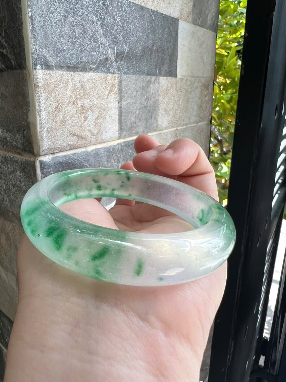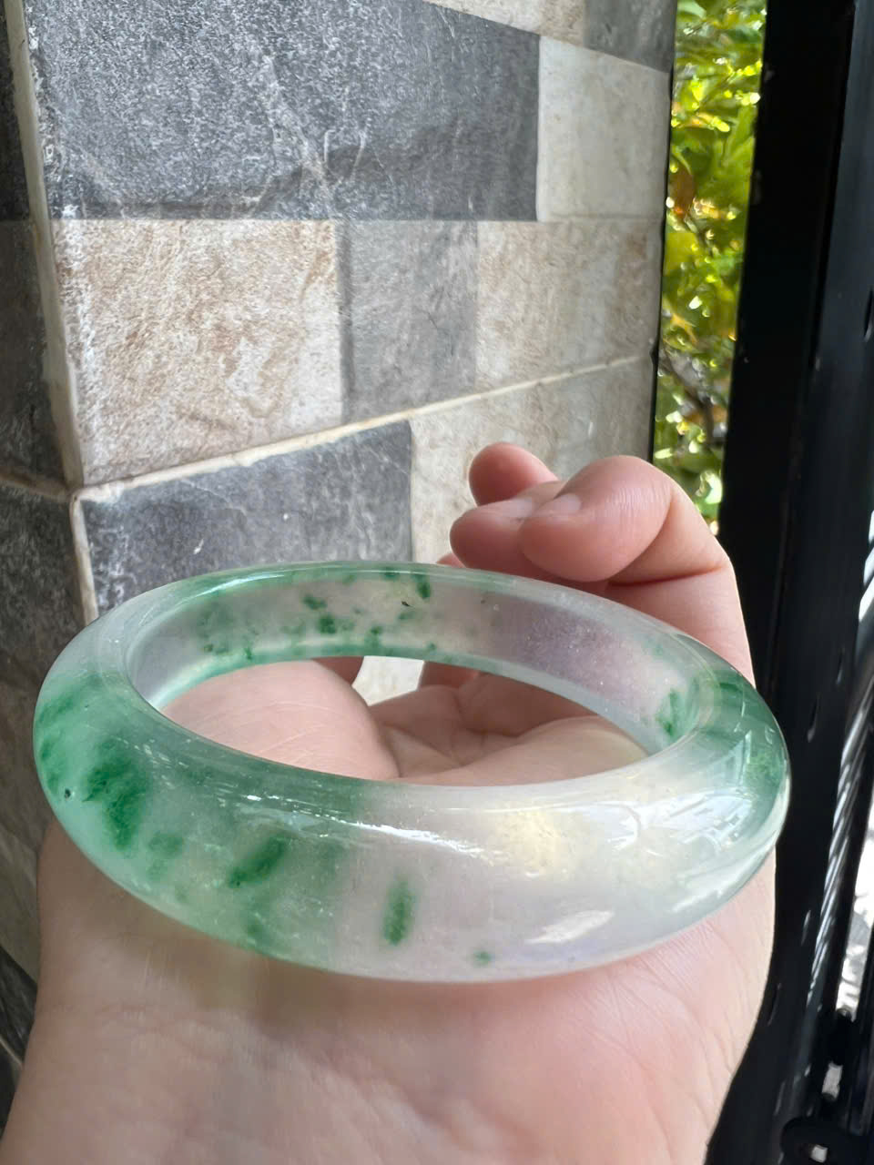 Vòng tay Nữ Đá Cẩm Thạch mới TR Lý 57 mm x cọng 7,5mm Màu Xanh lý tươi trắng 2 bên đều vòng đẹp Nữ 55kg - 64kg đeo đẹp món quà tặng chính mình