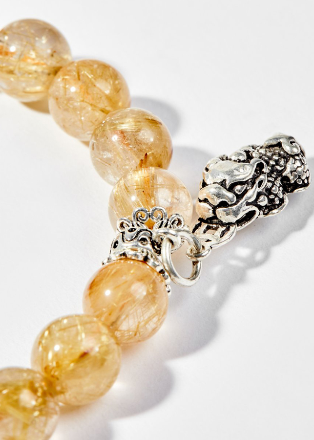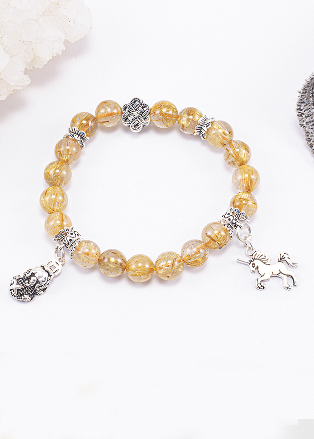 Từ lâu người ta đã biết đến đá thạch anh tóc vàng còn một tên khác là " Đá chiêu tài" - viên đá của người thành công giúp xua đuổi vận rủi, tinh thần sảng khoái và tập trụng để đưa ra quyết định đúng đắn thuận lợi trên con đường thanh quan tiến chức của gia chủ. Vòng Tay Phong Thủy Nữ Đá Thạch Anh Tóc Vàng Phối Charm Tỳ Hưu & Kỳ Lân Bạc (8mm) Mệnh Thổ, Kim được làm từ đá thạch anh tóc vàng và hành động đeo trang sức đá thạch anh tóc vàng chứng tỏ bạn yêu quý bản thân và sức khỏe của mình.