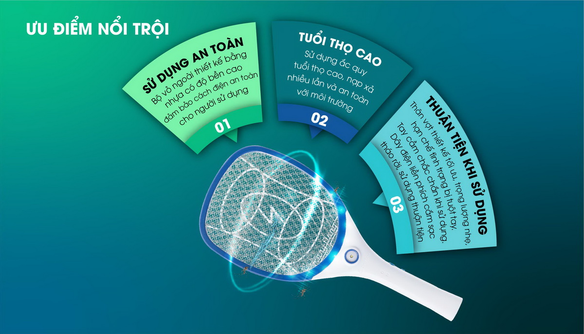 - Lưới vợt thiết kế 3 lớp tiêu diệt muỗi nhanh chóng.