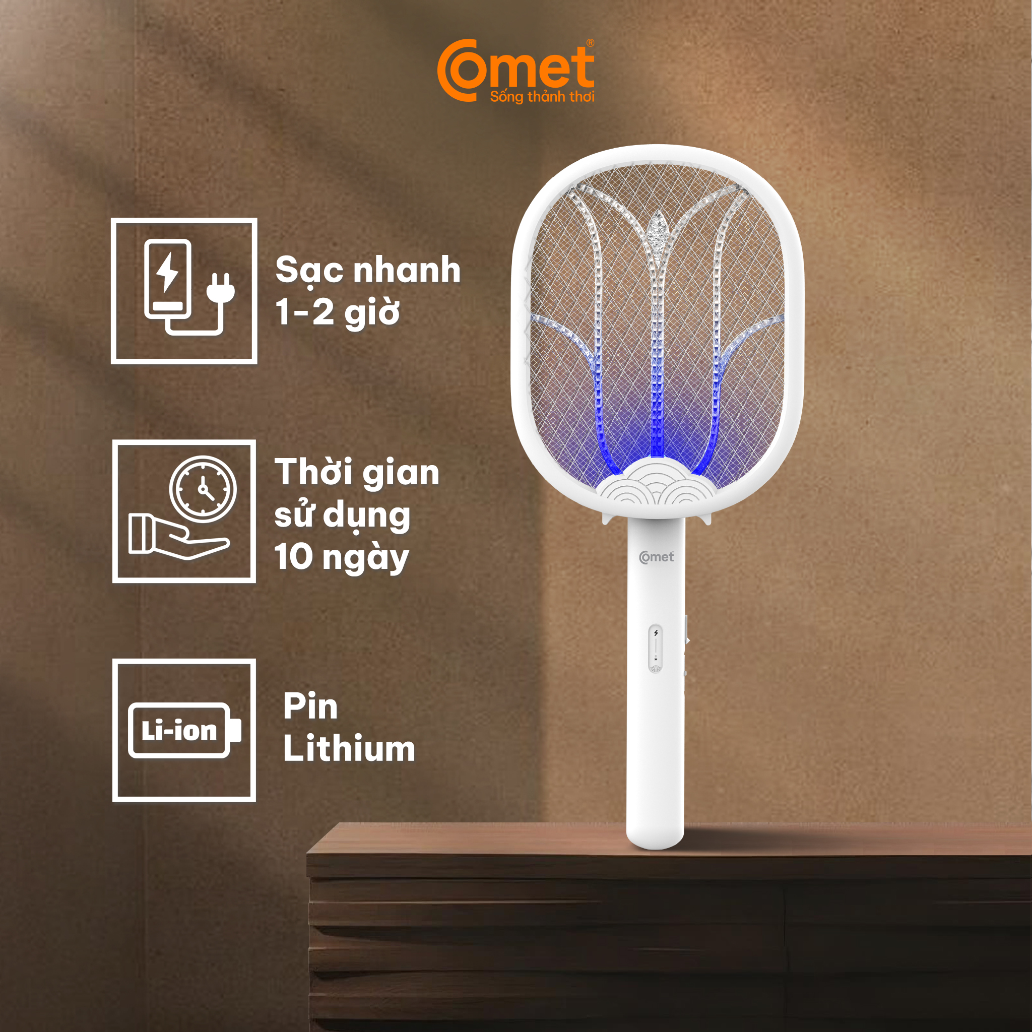 ✨Vợt muỗi điện Comet CP048 Pin Lithium 500mAh sạc 2h dùng 10 ngày BH 12T cổng sạc type C