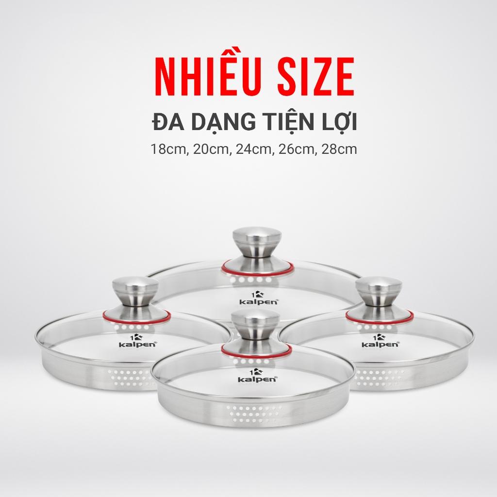 Vừa vặn với tất cả các loại nồi chảo trên thị trường : Nắp vung kính Kalpen có nhiều size đa dạng từ 18cm, 20cm, 24cm, 26cm, 28cm kết hợp với thiết kế thành vung cao vì thế nó phù hợp với tất cả các loại nồi chảo trên thị trường.