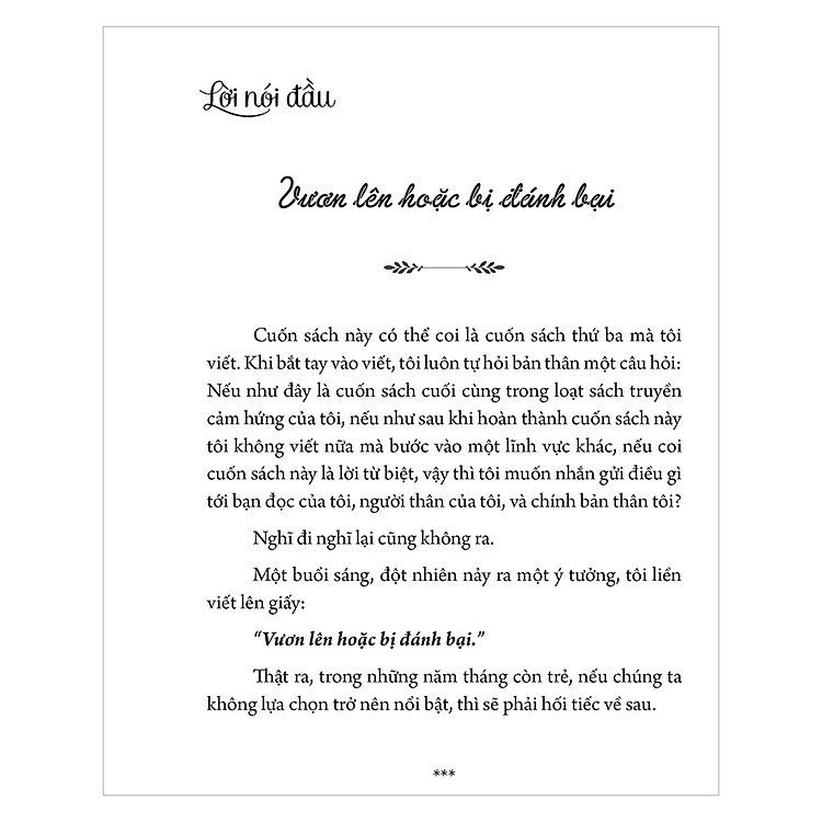 Cuốn sách này có thể coi là cuốn sách thứ ba mà tôi viết. Khi bắt tay vào viết, tôi luôn tự hỏi bản thân một câu hỏi: Nếu như đây là cuốn sách cuối cùng trong loạt sách truyền cảm hứng của tôi, nếu như sau khi hoàn thành cuốn sách này tôi không viết nữa mà bước vào một lĩnh vực khác, nếu coi cuốn sách này là lời từ biệt, vậy thì tôi muốn nhắn gửi điều gì tới bạn đọc của tôi, người thân của tôi, và chính bản thân tôi?