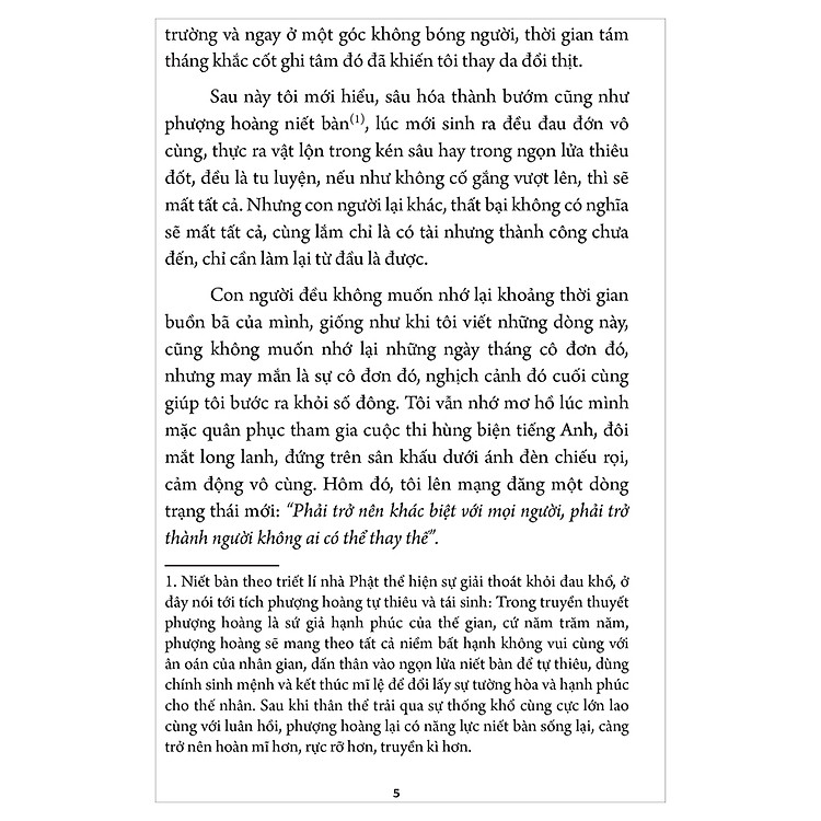 Sau này tôi mới hiểu, sâu hóa thành bướm cũng như phượng hoàng niết bàn(1), lúc mới sinh ra đều đau đớn vô cùng, thực ra vật lộn trong kén sâu hay trong ngọn lửa thiêu đốt, đều là tu luyện, nếu như không cố gắng vượt lên, thì sẽ mất tất cả. Nhưng con người lại khác, thất bại không có nghĩa sẽ mất tất cả, cùng lắm chỉ là có tài nhưng thành công chưa đến, chỉ cần làm lại từ đầu là được. Con người đều không muốn nhớ lại khoảng thời gian buồn bã của mình, giống như khi tôi viết những dòng này, cũng không muốn nhớ lại những ngày tháng cô đơn đó, nhưng may mắn là sự cô đơn đó, nghịch cảnh đó cuối cùng giúp tôi bước ra khỏi số đông. Tôi vẫn nhớ mơ hồ lúc mình mặc quân phục tham gia cuộc thi hùng biện tiếng Anh, đôi mắt long lanh, đứng trên sân khấu dưới ánh đèn chiếu rọi, cảm động vô cùng. Hôm đó, tôi lên mạng đăng một dòng trạng thái mới: “Phải trở nên khác biệt với mọi người, phải trở thành người không ai có thể thay thế”. Sau đó, tôi giành được huy chương đồng, cuộc thi đó đã thay đổi cuộc đời tôi.
