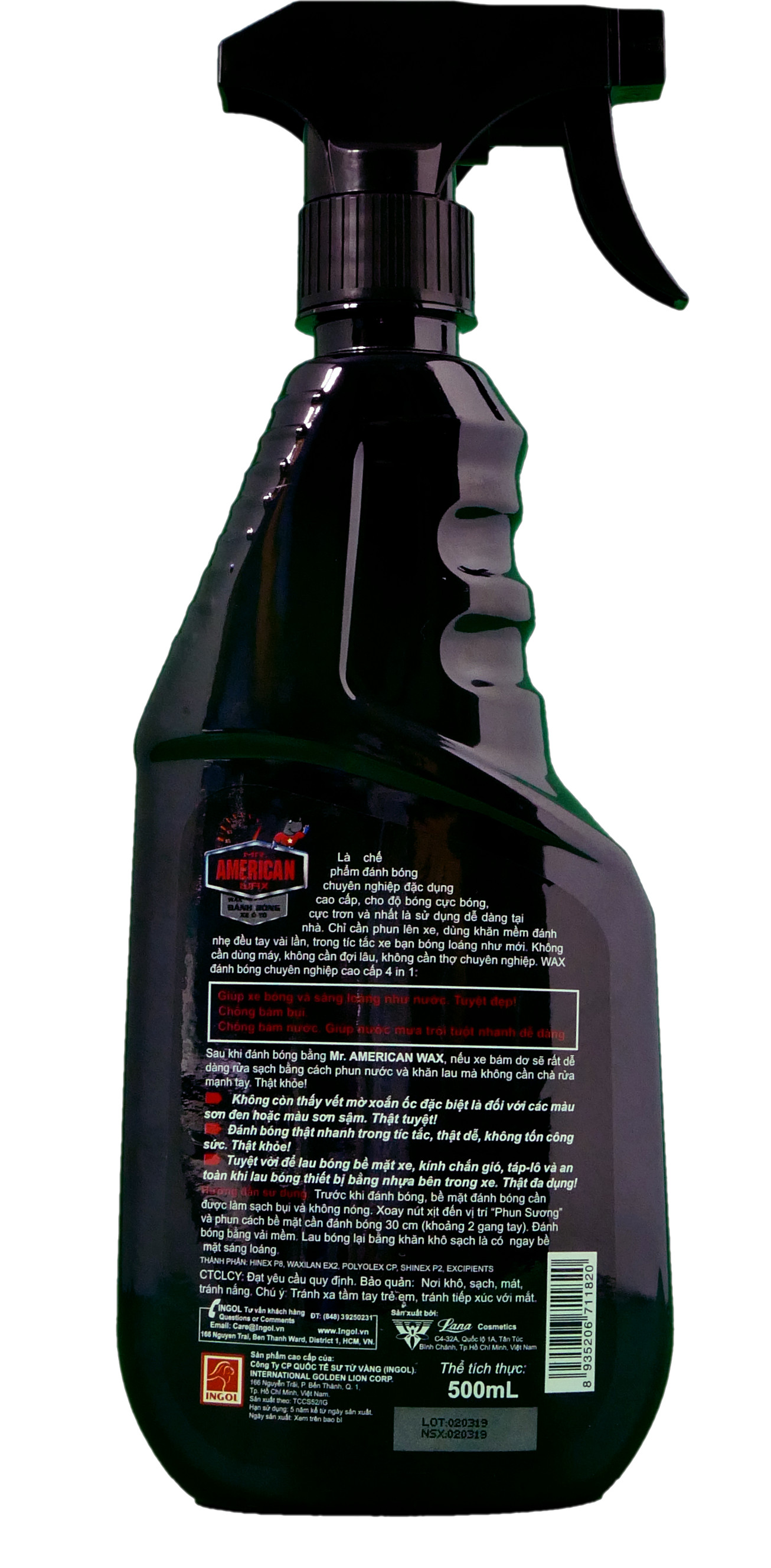 Sau một thời gian sử dụng ô tô, với thời tiết khắc nghiệt như Việt Nam, thì việc sử dụng cách đánh bóng xe ô tô để phục hồi, tân trang và làm đẹp bề mặt sơn là nhu cầu thiết yếu và cũng là vấn đề lớn đối với các chủ xe. Mr. American Wax là chế phẩm đánh bóng chuyên nghiệp, cao cấp, cho độ bóng cực bóng, cực trơn và nhất là dễ dàng sử dụng tại nhà. Chỉ cần phun lên xe, dung khăn mềm đánh nhẹ đều tay vài lần, trong tích tắc, xe bạn sẽ bóng loáng như mới. Không cần dung máy, không cần đợi lâu, không cần thợ chuyên nghiệp. Sau khi đánh bóng bằng Mr. American Wax, nếu xe bám dơ sẽ rất dễ dàng rửa sạch bằng cách phun nước và khăn lau mà không cần chà rửa mạnh tay. Thật khỏe!