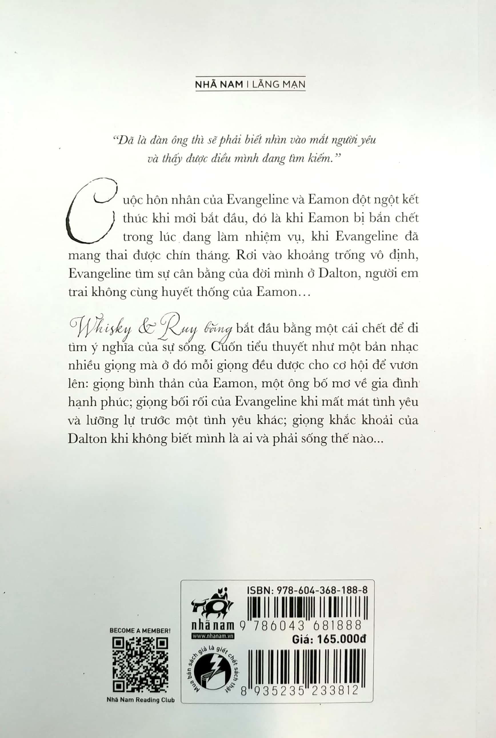 Có những cuộc hôn nhân kết thúc sau nhiều năm gầy dựng, cũng có những cuộc hôn nhân kết thúc khi mọi thứ dường như chỉ mới bắt đầu. Cuộc hôn nhân của Evangeline và Eamon là một câu chuyện như thế. Eamon bị bắn chết trong lúc đang làm nhiệm vụ, khi ấy Evangeline đã mang thai được chín tháng. Rơi vào khoảng trống vô định, Evangeline tìm sự cân bằng của đời mình ở Dalton, người em trai không cùng huyết thống của Eamon… Whisky & Ruy băng bắt đầu bằng một cái chết để đi tìm ý nghĩa của sự sống. Cuốn tiểu thuyết như một bản nhạc nhiều giọng mà ở đó mỗi giọng đều được cho cơ hội để vươn lên. Đó là giọng bình thản của Eamon từ những ngày trước khi trở thành một ông bố mơ về gia đình hạnh phúc; giọng bối rối của Evangeline khi thiếu đi một tình yêu và lưỡng lự trước một tình yêu khác; giọng khắc khoải của Dalton vì không biết phải sống thế nào và không biết mình thật sự là ai.