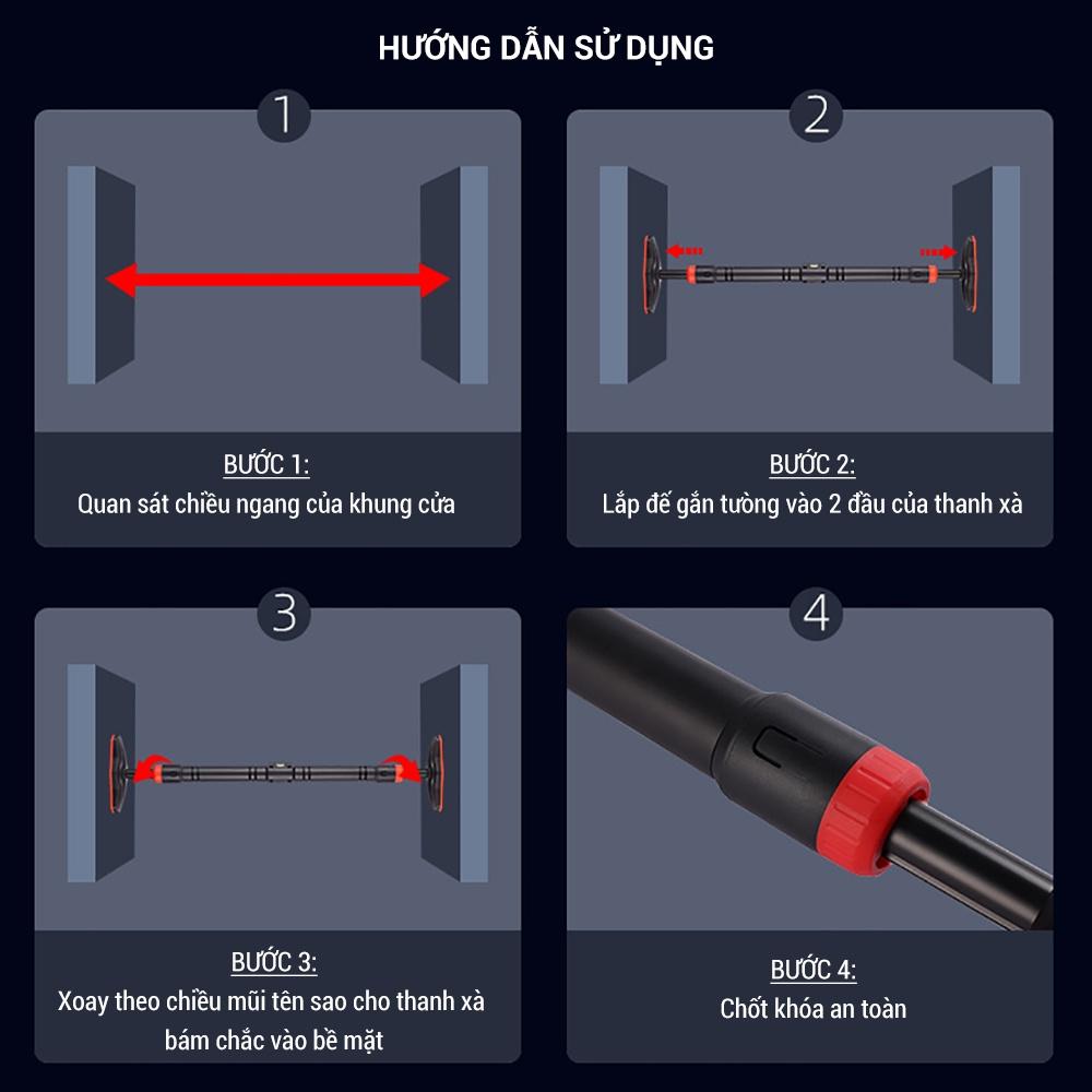 Mô Tả Sản Phẩm 1.Các thông số kỹ thuật của xà đơn treo tường gắn cửa đen đỏ cao cấp. - Kích thước điều chỉnh: + 60cm-110cm-(Lắp cho chiều rộng từ 60cm-85cm). + 83cm-130cm-(Lắp cho
