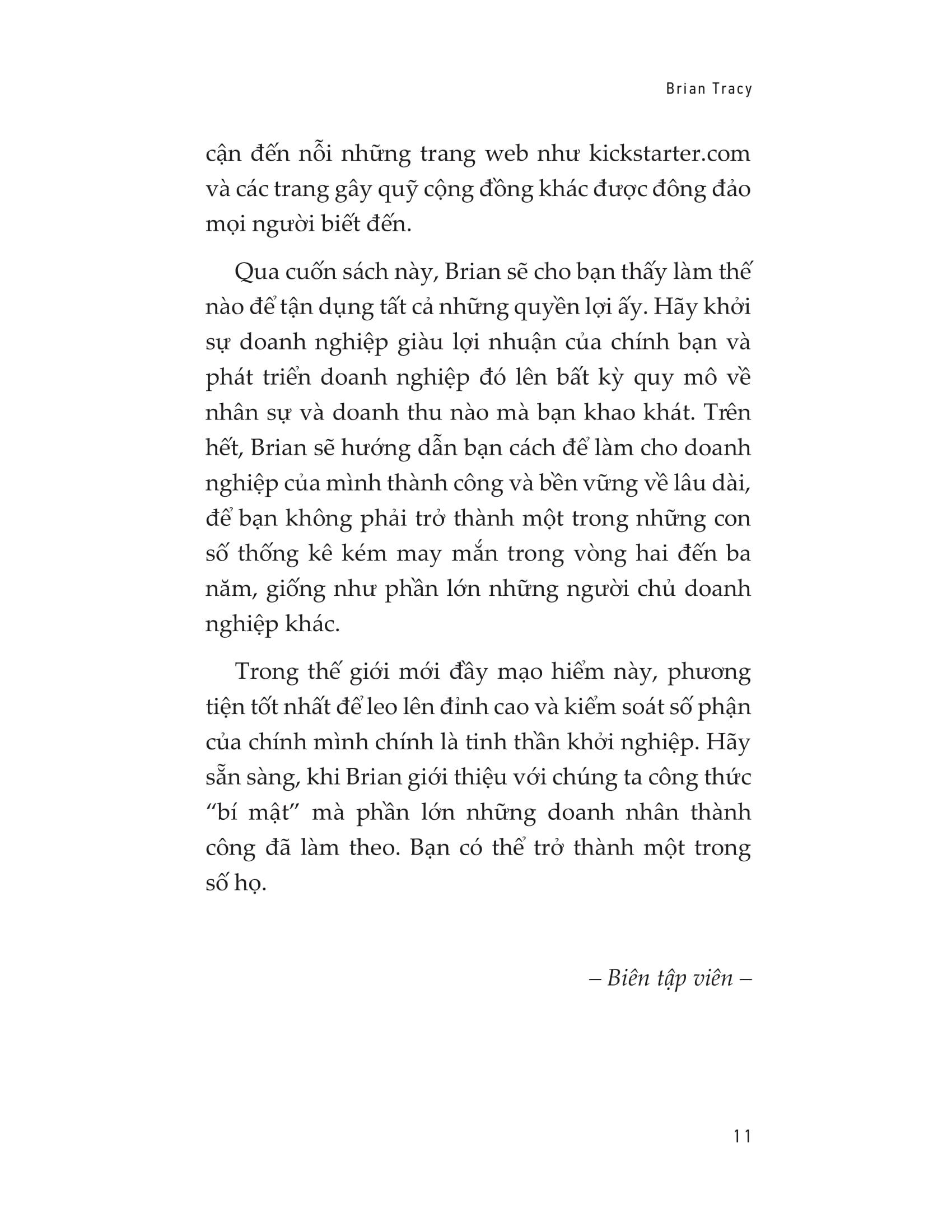 Qua cuốn sách này, Brian sẽ cho bạn thấy làm thế nào để tận dụng tất cả những quyền lợi ấy. Hãy khởi sự doanh nghiệp giàu lợi nhuận của chính bạn và phát triển doanh nghiệp đó lên bất kỳ quy mô về nhân sự và doanh thu nào mà bạn khao khát. Trên hết, Brian sẽ hướng dẫn bạn cách để làm cho doanh nghiệp của mình thành công và bền vững về lâu dài.