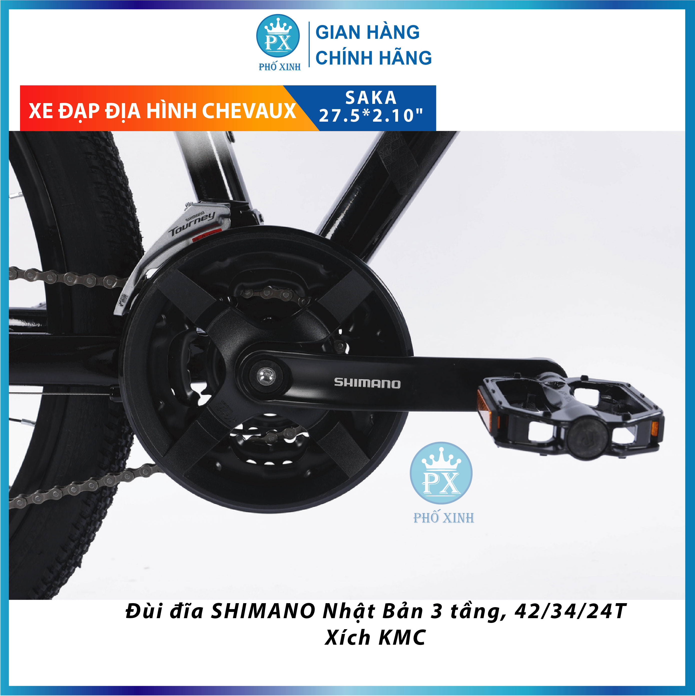 XE ĐẠP CHEVAUX SAKA Xe đạp Chevaux Saka là mẫu xe địa hình băng đồng với nước sơn tĩnh điện cao cấp và theo phong cách ombre đầy ấn tượng, cá tính. Đây là một “ngựa chiến” hoàn hảo cho những ai muốn bước chân vào thế giới của những cung đường hoang dã, và cần một chiếc xe leo núi thực thụ với mức giá hợp lý. Thông số kỹ thuật Model CHEVAUX SAKA Đùi đĩa S H I M A N O Nhật Bản 3 tầng, 42/34/24T Size 17 Trục giữa Cốt vuông, bạc đạn Trọng lượng 15.2kg Đùm Joytech Đài Loan Tem kiểm định BAA Nhật Bản Phanh Dầu thủy lực S H I M A N O Nhật Bản Khung Khung nhôm 6061 siêu nhẹ, không mối hàn Sơn tĩnh điện cao cấp, phong cách ombre hiện đại, ấn tượng Phuộc Phuộc dầu CHEVAUX có khóa hành trình Xích KMC Lốp KENDA 27.52.10" Tay đề S H I M A N O Nhật Bản M315 24s Vành Nhôm CHEVAUX 2 lớp 27.5 Củ đề S H I M A N O Altus M310 8s Nhật Bản Yên Yên thể thao siêu mềm CHEVAUX Gạt đĩa S H I M A N O Tourney 3s Nhật Bản Pô tang/ Ghi đông/ Cọc Yên Nhôm CHEVAUX Líp S H I M A N O HG200 - 8 tầng, 12-32T Khung sườn nhôm cao cấp T6 (ALU6061) Khung sườn của dòng xe này có chất liệu từ hợp kim nhôm cao cấp cứng cáp T6, chắc chắn và trọng lượng nhẹ. Chiếc xe này phù hợp với các bạn trẻ có chiều cao khoảng 1m55 – 1m8. Lớp sơn tĩnh điện cao cấp giúp xe luôn trong trạng thái sáng bóng như mới, dễ dàng vệ sinh khi bám bẩn, khó bong tróc. Ghi đông tay ngang, tay nắm da mềm mại chắc tay Mẫu xe city bike này sở hữu ghi đông dạng thẳng cổ điển, dễ sử dụng, không chỉ đem lại cho xe bề ngoài gọn và đẹp mắt mà còn giúp xe dễ dàng di chuyển vào những con đường gồ ghề, dốc cao An toàn di chuyển với bánh xe có nhiều gai Chiếc xe đạp này được trang bị bánh xe vơi lốp xe KENDA 27.52.10". Ngoài ra, với vành xe là hợp kim nhôm 2 lớp Chevaux cứng cáp và nhiều gai, người dùng có thể yên tâm di chuyển trên những đoạn đường trơn trượt. Bộ đề S h i m a n o mạnh mẽ Bộ truyền động S H I M A N O Nhật Bản M315 24s vận hành mượt mà, mạnh mẽ với 24 tốc độ giúp cho việc sang số trở nên dễ dàng và mượt mà, bộ líp  S H I M A N O HG200 - 8 tầng, 12-32T bền bỉ, kết hợp với Gạt đĩa S H I M A N O Tourney 3s Nhật Bản cho khả năng vận hàng êm ái, dễ chịu, mang đến cho bạn sự an tâm và thoải mái khi trải nghiệm những cung đường mà bạn yêu thích. Phanh đĩa dầu hoạt động an toàn, nhạy bén  S  h i m a n o hoạt động hiệu quả giúp người dùng dễ dàng điều chỉnh và kiểm soát tốc độ trên suốt chuyến hành trình của mình. Đảm bảo an toàn cho bản thân và những người xung quanh.  thoải mái Yên được làm nệm mút cao cấp, êm ái. Cọc yên hợp kim chắc chắn mang lại cảm giác thoải mái cho người đạp xe khi di chuyển những cung đường dài, gập ghềnh.  Bên cạnh vẻ ngoài năng động, xe đạp thể thao đường phố Chevaux Toto còn sở hữu dàn cấu hình rất chất lượng và một mức giá rất tốt, đảm bảo tính ổn định, vững chãi để người dùng có thể vi vu dạo mát, đi học, đi làm mỗi ngày. Đây chắc chắn là mẫu xe tuyệt vời dành cho các bạn trẻ thích vu vi dạo phố, đi làm, đi học, leo núi rèn luyện sức khỏe. TẠI SAO NÊN MUA XE ĐẠP TẠI PHỐ XINH? CỬa hàng Phố xinh là NPP xe đạp cho các thương hiệu hàng đầu như Giant, TWITTER, Califa Catani, Vicky, Chevaux, Calli, Catani… Phố Xinh không chỉ bán sản phẩm, chúng tôi muốn làm tốt hơn qua 04 việc sau: Hướng khách hàng đến lựa chọn phù hợp nhất Có trách nhiệm đảm bảo sản phẩm đến tay khách hàng là c  h í n h h ã n g. Tiết kiệm chi phí cho khách hàng qua việc tối ưu chuỗi cung ứng. Tiếp thu nhanh và xử lý đến cùng các sự cố về SP  #xedap #xediahinh #xedaptreem #xeđạp #xeđạpvicky #vicky #catani #xeđạp22 #xeđạpchobé3tuổi