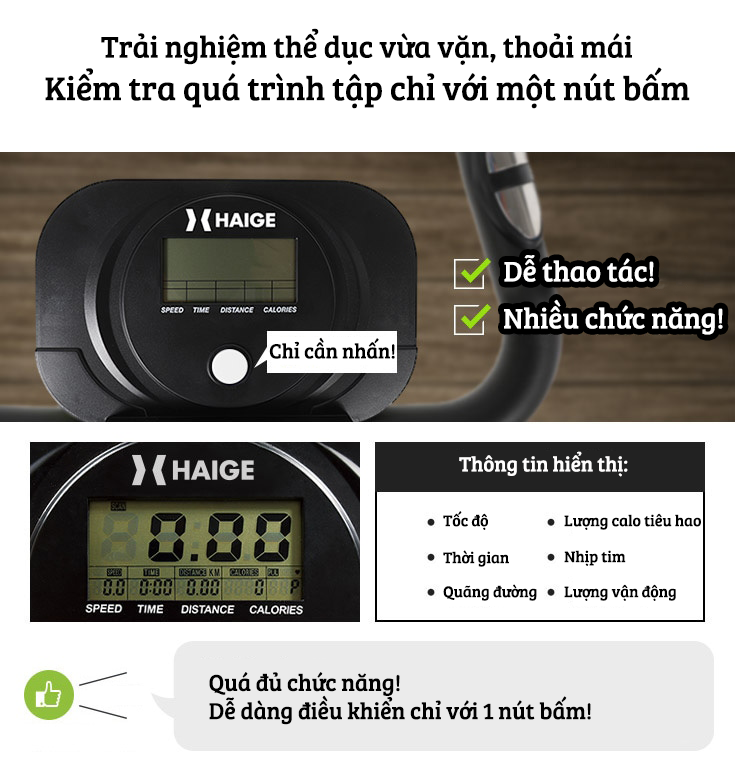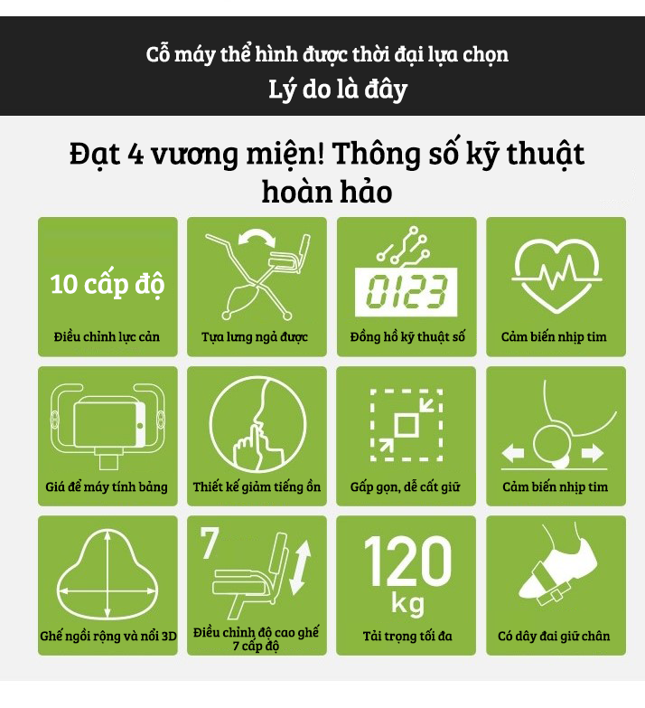 * THÔNG TIN CỦA SẢN PHẨM: Màu sắc: Xám Kích thước sản phẩm: 110 x 85 x 45cm Trọng lượng sản phẩm: 16 kg Có đồng hồ và cảm ứng nhịp tim * PHÂN