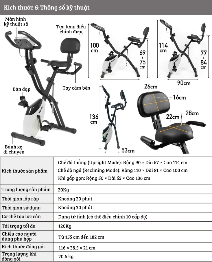 - Tải trọng : 130 kg - Kích thước: 129 x 61 x 160 cm - Trọng lượng: 47 kg - Trọng lượng bánh đà: 10 kg - 24 chế độ hỗ trợ tập luyện