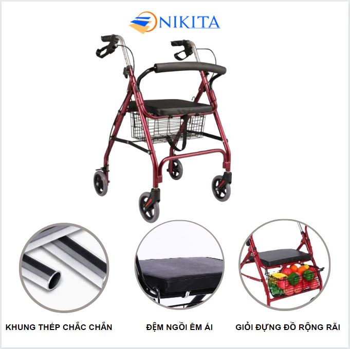 Xe tập đi bốn bánh cho người già có ghế ngồi, có giỏ đựng đồ, gấp gọn khi không sử dụng, chính hãng Nikita Xe tập đi có bánh lăn được thiết kế cổ điển với phanh vòng dễ khóa tiên tiến mang đến sự hỗ trợ và ổn định giúp việc đi lại dễ dàng hơn THÔNG SỐ - Thương hiệu: Nikita - Kích thước nệm: 40 x 30 x 5cm (Dài x Rộng x Cao)