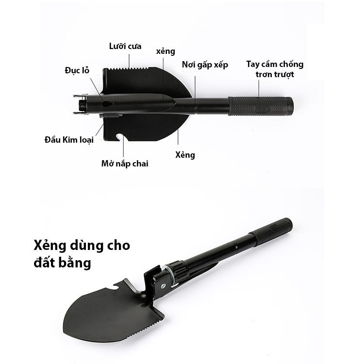 - Xẻng Đi Phượt Đa Năng - Đen : gồm túi vải đựng, lưỡi xẻng, ống modul với các chức năng khác nhau - Chất liệu: Lưỡi xẻng được làm bằng thép không rỉ chất