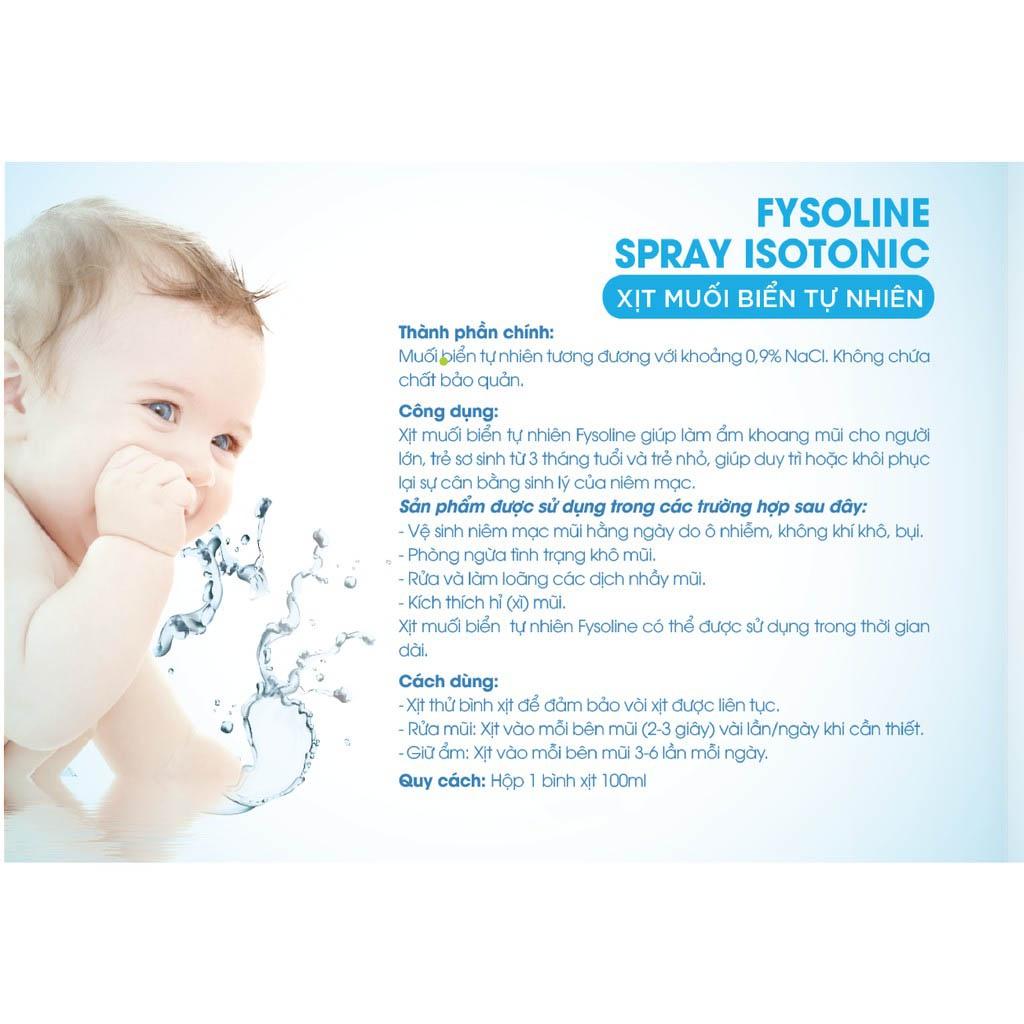 Mua tại Tiktok- 100% nước muối biển tự nhiên- Dạng xịt phun sương, êm dịu- Không chứa chất bảo quản- Dùng cho trẻ sơ sinh từ 3 tháng tuổi, trẻ em và người lớn Thành phần chính: Muối biển tự nhiên tương đương với khoảng 0,9% NaCl. Không chứa chất bảo quản. *Công dụng: Xịt muối biển tự nhiên Fysoline giúp làm ẩm khoang mũi cho người lớn, trẻ sơ sinh từ 3 tháng tuổi và trẻ nhỏ, giúp duy trì hoặc khôi phục lại sự cân bằng sinh lý của niêm mạc. Sản phẩm được sử dụng trong các trường hợp sau đây: