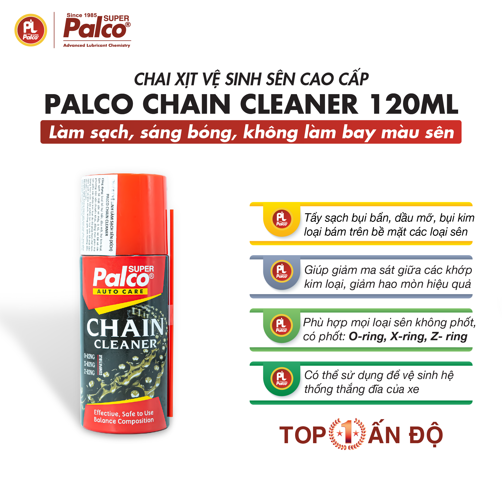 • Sử dụng xịt vệ sinh sên lại định kỳ thường xuyên để đảm bảo sên luôn được sạch sẽ, giúp bảo dưỡng và kéo dài thời gian sử dụng của sên   ĐÓNG GÓI: Chai xịt 120 ml   CẢNH BÁO & BẢO QUẢN: Lưu trữ ở nơi thoáng mát, không để trong môi trường quá 50 độ C. Tránh xa nguồn lửa. Để ngoài tầm với của trẻ em.     VỀ THƯƠNG HIỆU PALCO Paras Lubricants được thành lập năm 1985 với trụ sở chính tại Mumbai, 1 văn phòng đại diện ở Tây Ấn và 2 nhà máy hiện đại đặt tại Khopoli và Daman. Đây là tập đoàn đã hoạt động 38 năm trên thị trường mỡ bò, dầu nhớt và sản phẩm chăm sóc xe với 2 thương hiệu chính, gồm: • PALCO Lubricants: chuyên về dầu nhớt và mỡ bôi trơn • PALCO Auto care: chuyên về sản phẩm chăm sóc xe     Ngoài ra, tập đoàn còn hoạt động trong lĩnh vực thương mại với thương hiệu PALCO EXIM và GREENOIL. PALCO đạt tiêu chí quản trị sản xuất ISO 9001:2005 và tiêu chuẩn chất lượng sản phẩm quốc tế JASO và API. Sản phẩm PALCO rất nổi tiếng tại thị trường Ấn Độ về chất lượng. Đây là nhãn hiệu hàng đầu và được nhiều doanh nghiệp lớn sử dụng như: hãng hàng không Air India, Không quân India Air Force, hãng vận tải Container Corporation India, doanh nghiệp đường sắt Indian Railways, doanh nghiệp khai thác than Coal India, hiệp hội nông nghiệp Ấn Độ, Viện kỹ thuật quốc gia, Bộ quốc phò Thị trường xuất khẩu: Châu Úc, Mỹ Latin, Châu Phi và Việt Nam do SONAIMEX độc quyền phân phối.